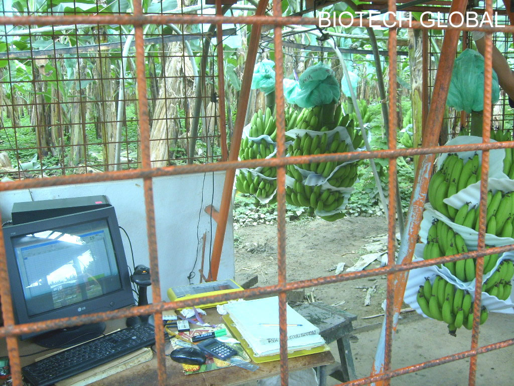 En la gráfica profesionales de Biotech Global y Agrosoft comprueban pesaje en linea de racimos de banano en red via internet